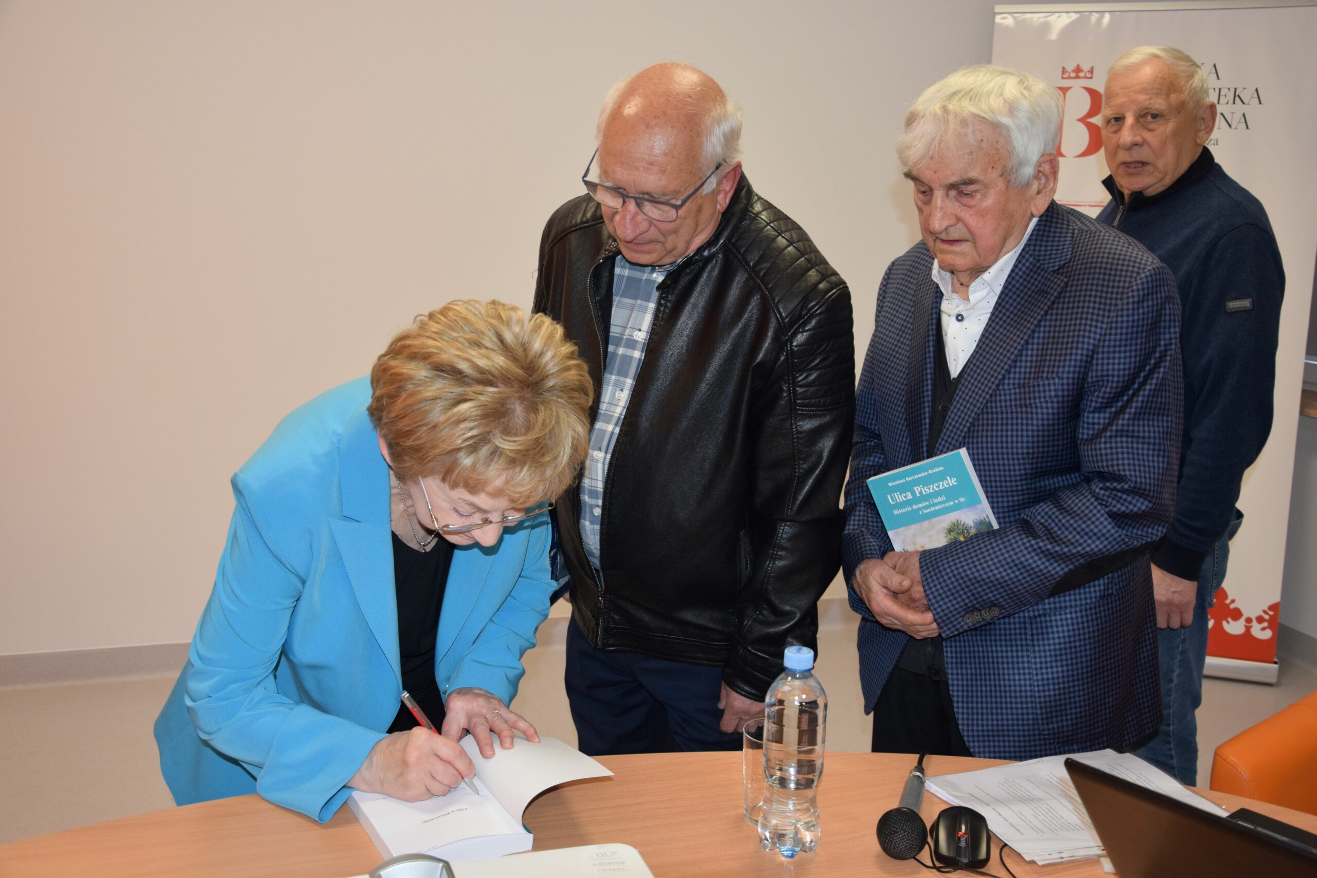 To spotkanie w MBP było promocją  jej najnowszej książki pt. „Ulica Piszczele. Historie domów i ludzi  z Sandomierzem w tle”. Odbyło się w bardzo miłej atmosferze pełnej wspomnień i wzruszeń. Wśród licznie zgromadzonej publiczności znaleźli się znajomi i wieloletni przyjaciele z ulicy „Piszczele” autorki jak również profesorowie, koleżanki i koledzy z naszej szkoły. Nie mogło również zabraknąć  nas, przedstawicieli Klubu Sympatyków Szkoły „Sandomierska Marmolada” bo „Dumą szkoły są jej skarby”.