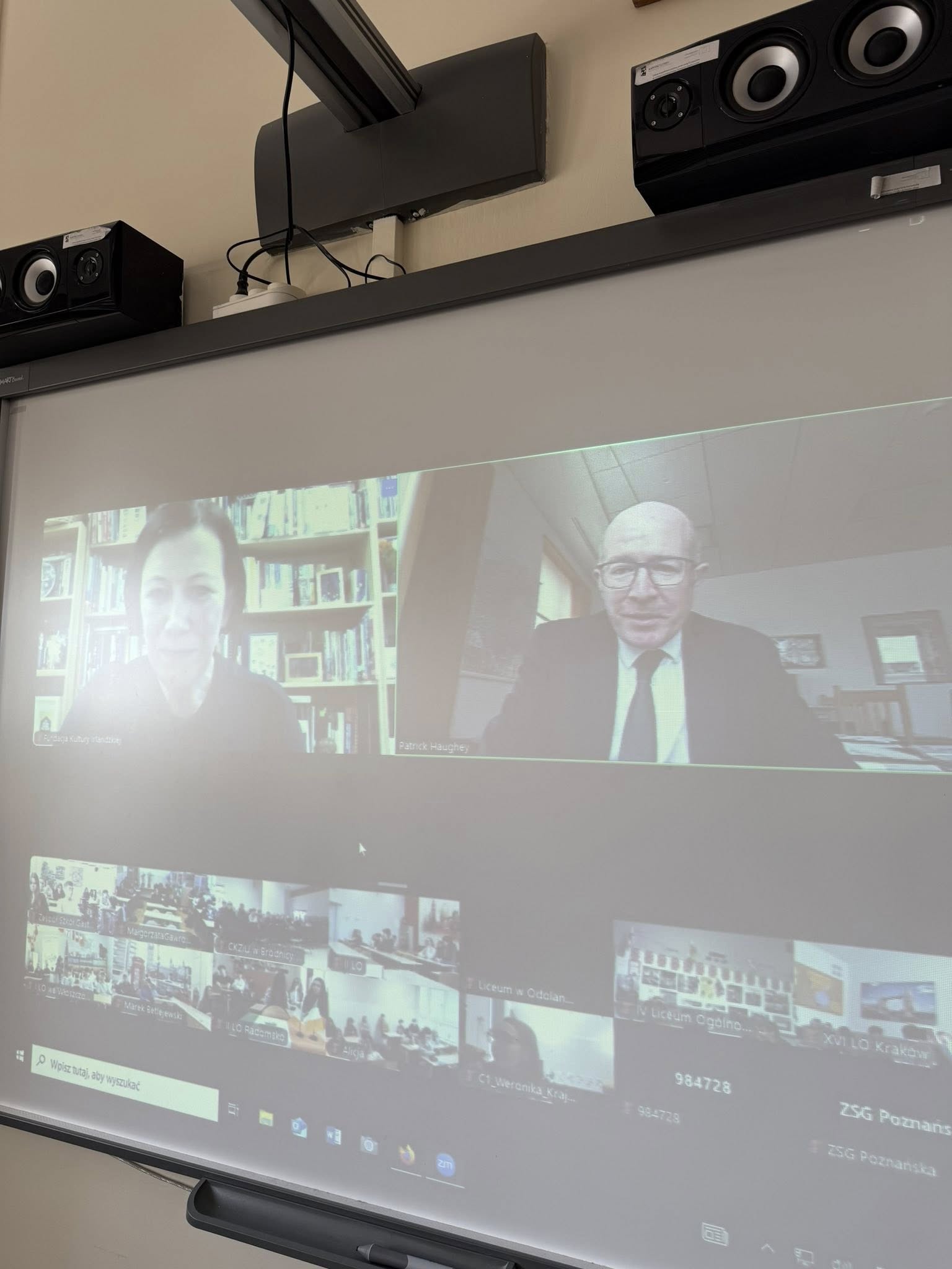 24 listopada 2025 r. uczniowie z kl. I LO, III LO oraz IV THŻ uczestniczyli w wyjątkowym spotkaniu z Jego Ekscelencją Patrickiem Haughey, Ambasadorem Irlandii w Polsce. Głównym tematem była współpraca międzynarodowa i budowanie relacji między krajami.