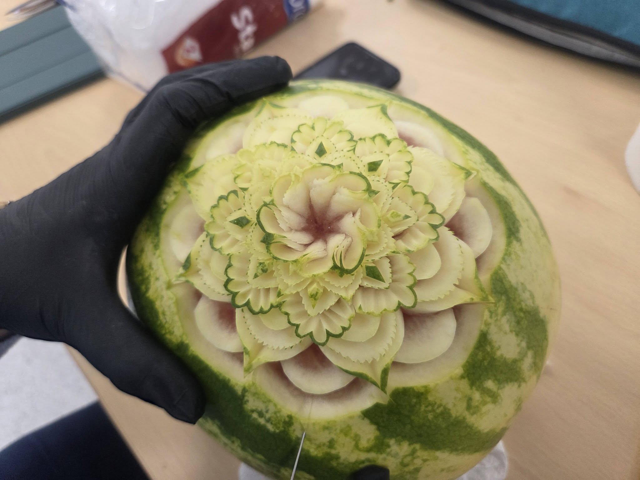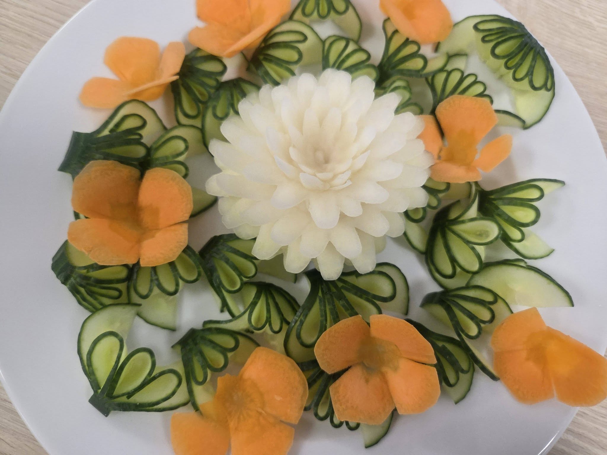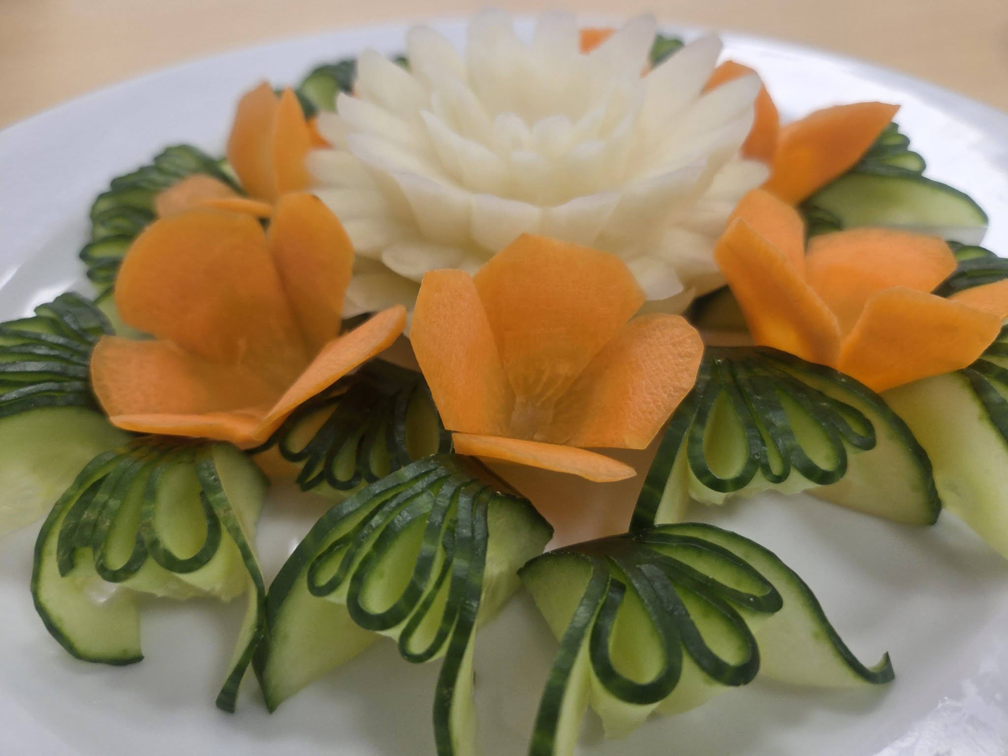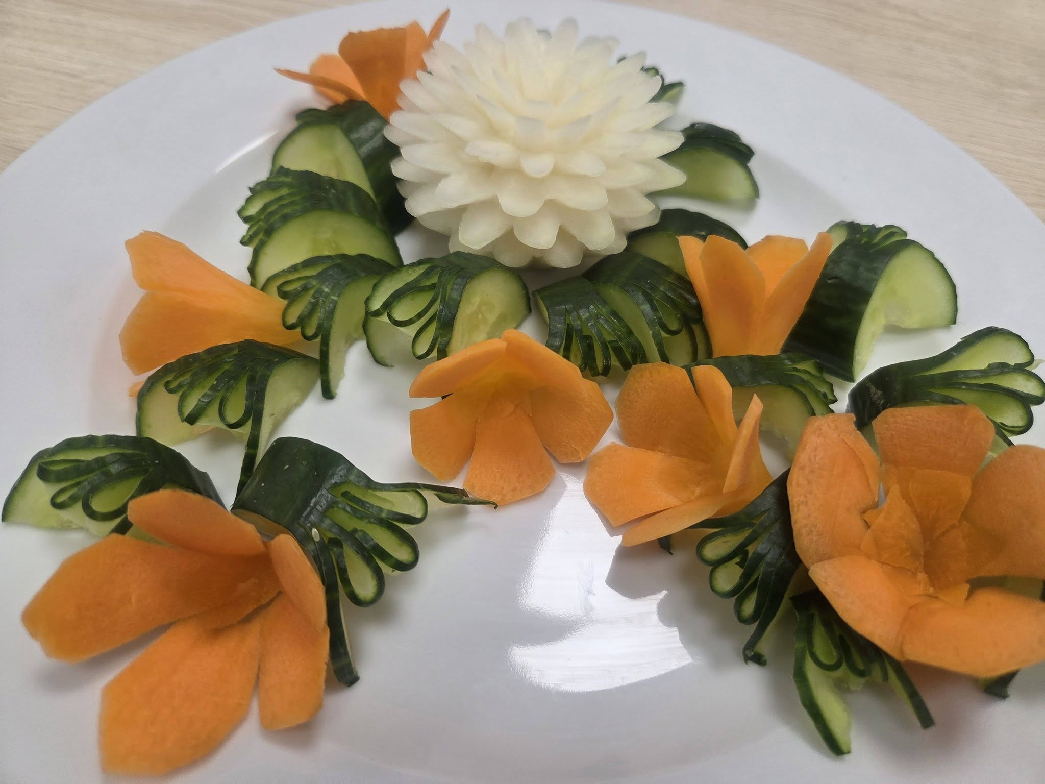 Uczniowie klasy 2Bkc uczestniczyli w warsztatach carvingu (sztuki rzeźbienia w owocach i warzywach) z Wicemistrzynią Świata Carvingu Jolantą Grabiec. Dzięki instrukcjom prowadzącej powstały piękne dekoracje potraw i stołów, a zdobyte umiejętności, uczniowie będą mogli wykorzystać podczas okolicznościowych imprez i zachwycić nimi gości.